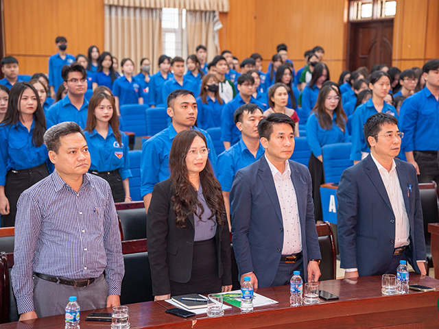 Lá cờ Tổ quốc tung bay cùng với huy hiệu đoàn, Quốc ca và Đoàn ca vang lên hùng tráng, khơi dậy niềm tự hào và tinh thần tuổi trẻ.